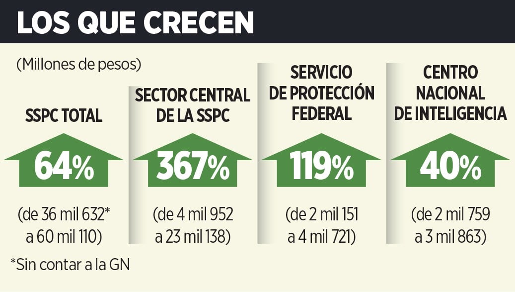 Desde 2025, la SSPC dejó de tener bajo su cargo directo a la GN, aunque aún soportaba parte de la carga presupuestal, y por eso aparentaba que su presupuesto total era de más de 70 mil millones de pesos, pero casi la mitad iban a la corporación policial militarizada.
