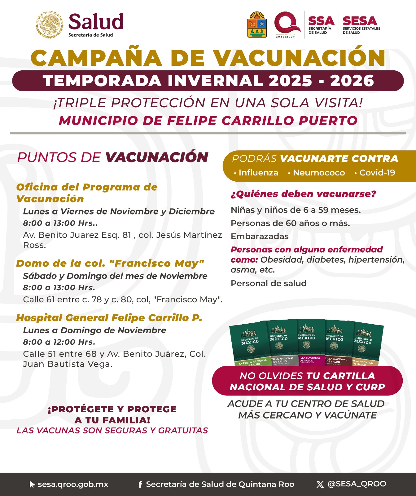 No obstante, cabe mencionar que a partir del 13 de octubre inició la Campaña de Vacunación Invernal 2025-2026, en la que se aplican vacunas contra Covid-19, influenza y neumococo a niñas y niñas de 6 a 59 meses; adultos de 60 años y más; embarazadas; personas con enfermedades crónicas como diabetes, hipertensión obesidad, asma y otras, y personal de salud, en centros de salud y puntos de vacunación en sitios públicos cuya ubicación publica la Sesa en sus redes sociales.