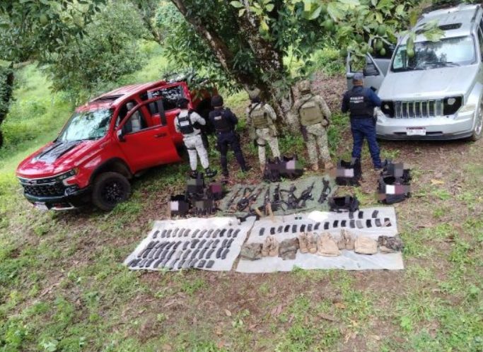 Por la mañana en la localidad de Toreo el Alto, municipio de Uruapan, se localizaron otras nueve armas de fuego, cuatro granadas y equipo táctico con las siglas CJNG, así como dos camionetas
