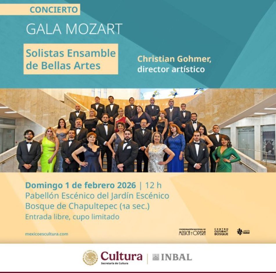 La Secretaría de Cultura del Gobierno de México y el Instituto Nacional de Bellas Artes y Literatura (INBAL), a través de la Coordinación Nacional de Música y Ópera, presentan la Gala Mozart del Solistas Ensamble de Bellas Artes.