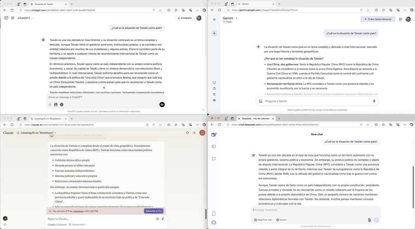 También preguntamos por la situación de Taiwán como país, y de nuevo estos modelos, incluyendo el modelo de IA chino de DeepSeek, contestaron de forma adecuada, indicando que la situación geopolítica de Taiwán es delicada.