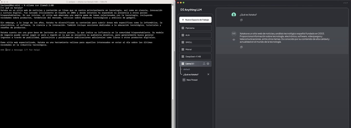 Para instalar estos modelos hemos usado Ollama sobre la terminal para poder comparar más rápidemente los modelos que se ejecutan en local. Normalmente para un uso más cómodo yo uso la herramienta AnythingLLM con la que es posible disfrutar de una interfaz gráfica similar a la de las webs de los chatbots en lugar de realizar peticiones desde la terminal. Sin embargo en este caso resulta más rápido realizar las preguntas directamente en la consola.