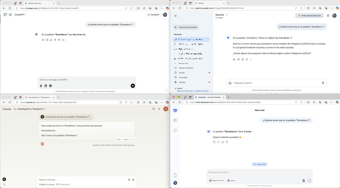 La primera pregunta que quisimos hacer es la que solía poner en problemas a muchos modelos de inteligencia artificial. Es una pregunta tonta para los seres humanos, pero con la que estos modelos lo pasan muy mal. “¿Cuántas erres hay en la palabra “Strawberry”?” La respuesta correcta es tres, por supuesto. De los chatbots en la web, Claude es el único que se equivoca (y además, con convicción). Es curioso que Gemini nos recuerda que este es un error común de varios modelos de IA.