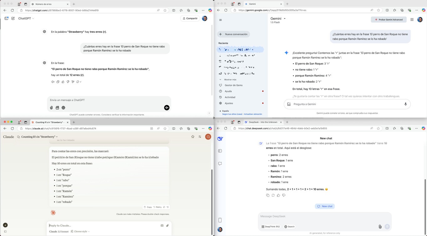 Entre  así que ponemos la cosa algo más complicada. “¿Cuántas erres hay en la frase ‘El perro de San Roque no tiene rabo porque Ramón Ramírez se lo ha robado'”. En esa frase hay nueve erres, pero veamos qué nos dicen los modelos.
