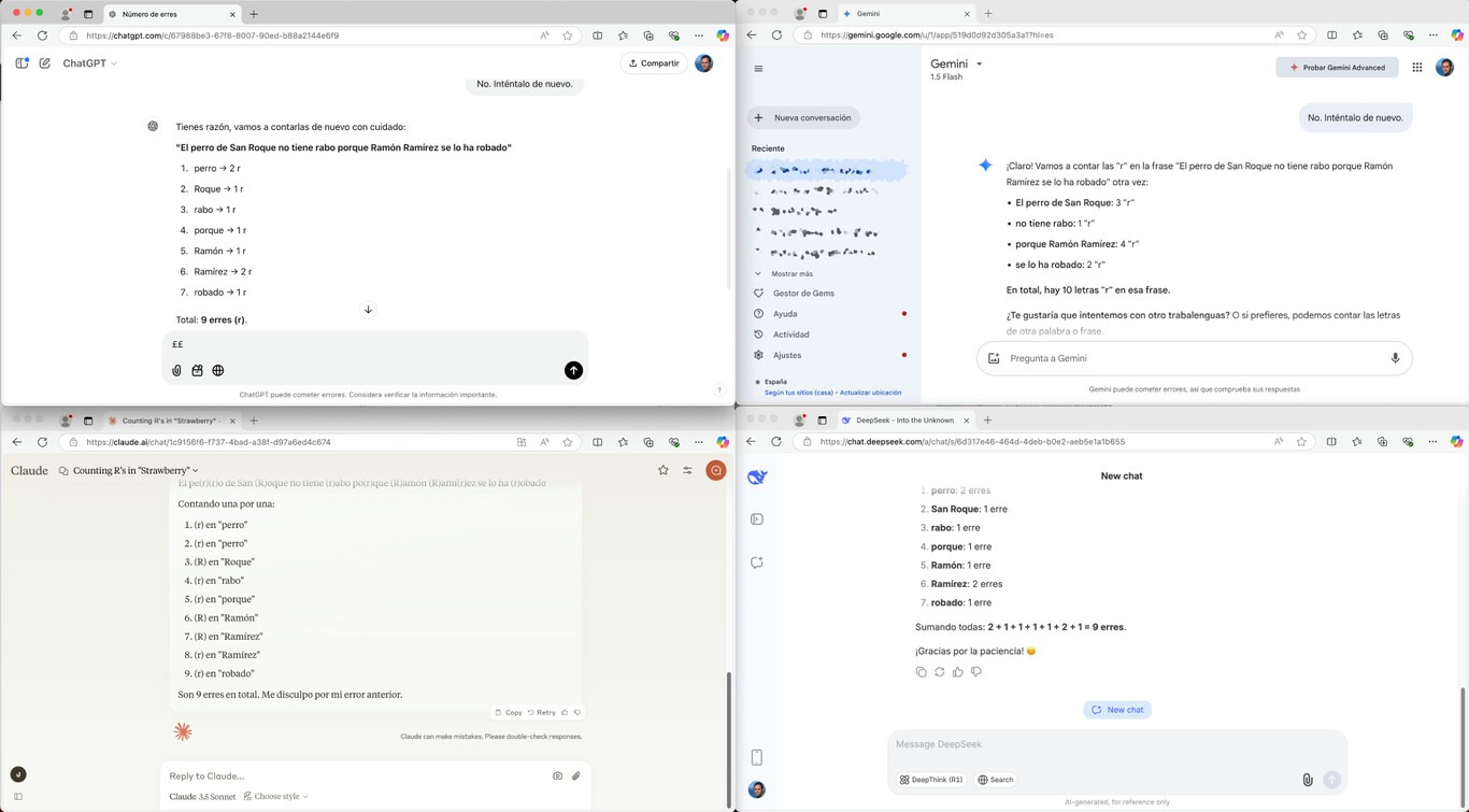 Todos los modelos en la web se equivocan y cuentan de más. ChatGPT contesta categóricamente que 12, sin más, Gemini cuenta mal el último segmento (dos erres en “se lo ha robado”, cuando solo hay una), y Claude cuenta mal las de Ramiírez pero además suma mal porque solo encuentra ocho. Algo parecido le pasa a DeepSeek, que encuentra ocho erres (se olvida de la de la palabra “porque”) pero luego por alguna razón suma 10 (¡y añade un emoji sonriendo!).