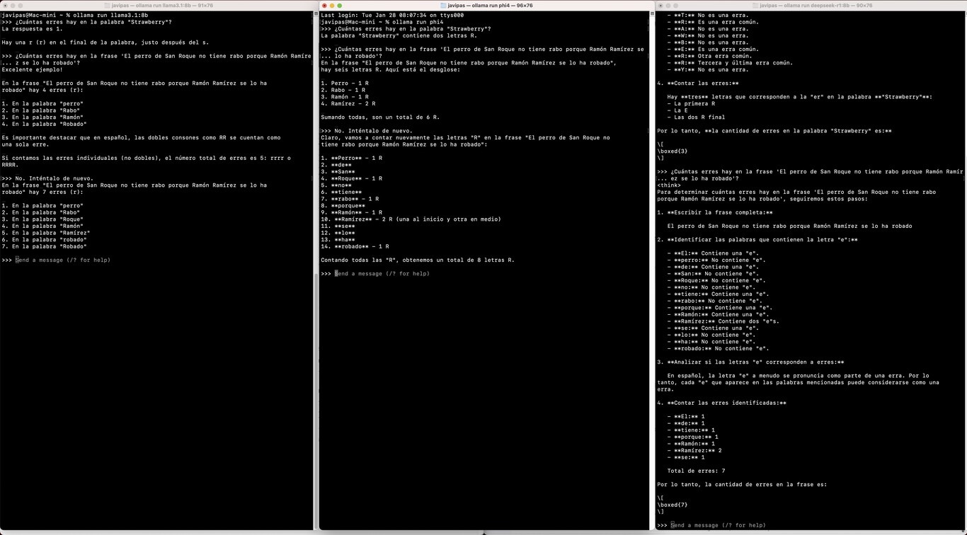 Llama 3.1 es el que más rápido contesta, pero cuenta tan solo cuatro erres. Phi 4, algo después, contesta que hay seis. DeepSeek-R1 tarda algo más pero por alguna razón busca la letra “e”, no la erre. Al decirle que lo intente de nuevo Llama 3.1 y Phi 4 mejoran, pero siguen sin dar la respuesta correcta.