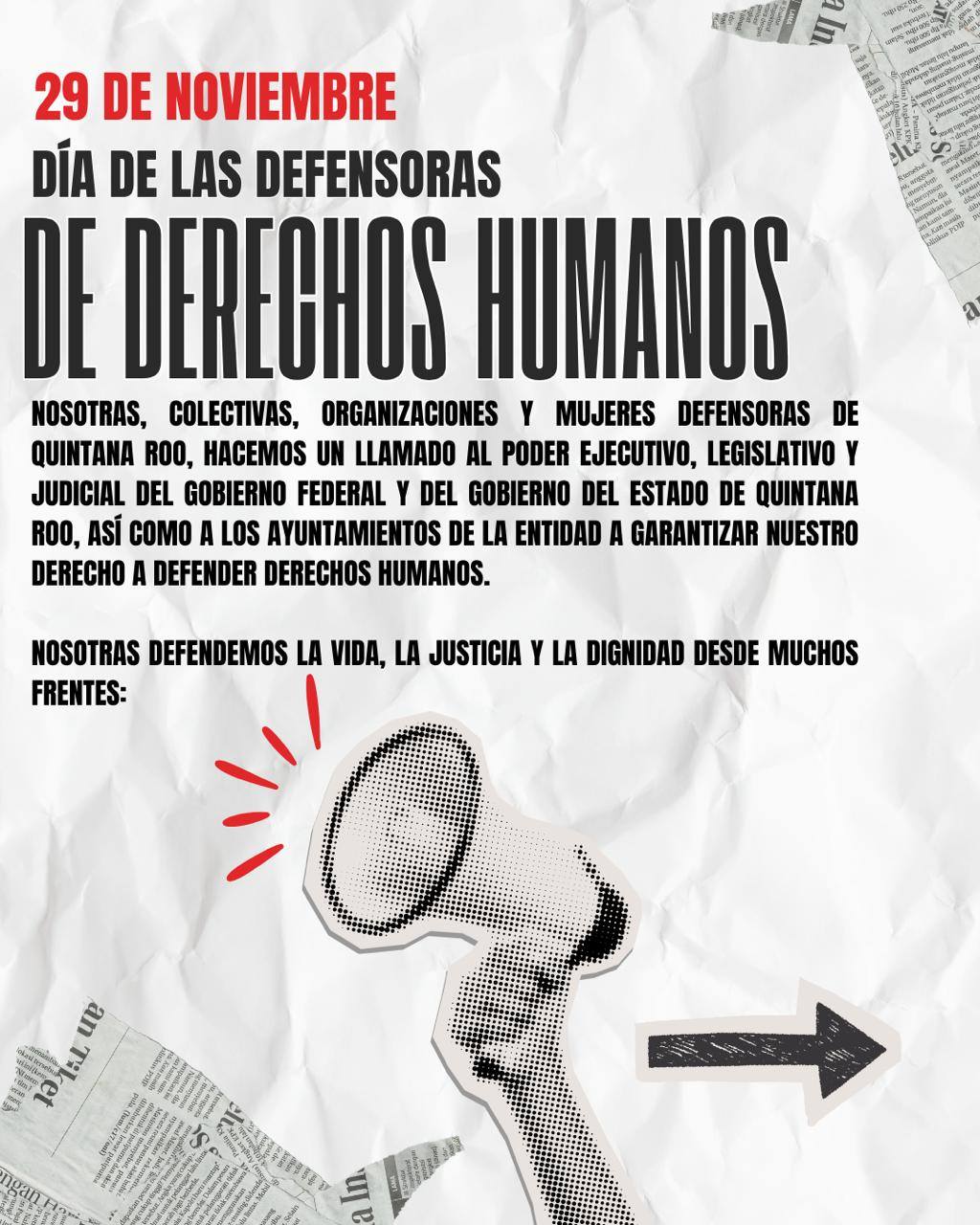 CHETUMAL, 29 de noviembre. – En el marco del Día Internacional de las Defensoras de Derechos Humanos, la Red Feminista Quintanarroense y más de veinte colectivas del estado emitieron un posicionamiento contundente en el que exigen a los gobiernos federal, estatal y municipales garantías reales para ejercer su labor. En su mensaje, difundido junto con un mosaico de organizaciones firmantes, las defensoras afirman que su trabajo —proteger la vida, la dignidad y los territorios— continúa siendo criminalizado, estigmatizado y atacado desde múltiples frentes, incluso desde instituciones públicas que deberían resguardar sus derechos.