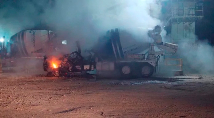 ► Un camión revolvedor de concreto fue incendiado por presuntos integrantes de un grupo delictivo en la madrugada. Bomberos sofocaron el fuego; no hubo heridos, pero sí pérdidas materiales