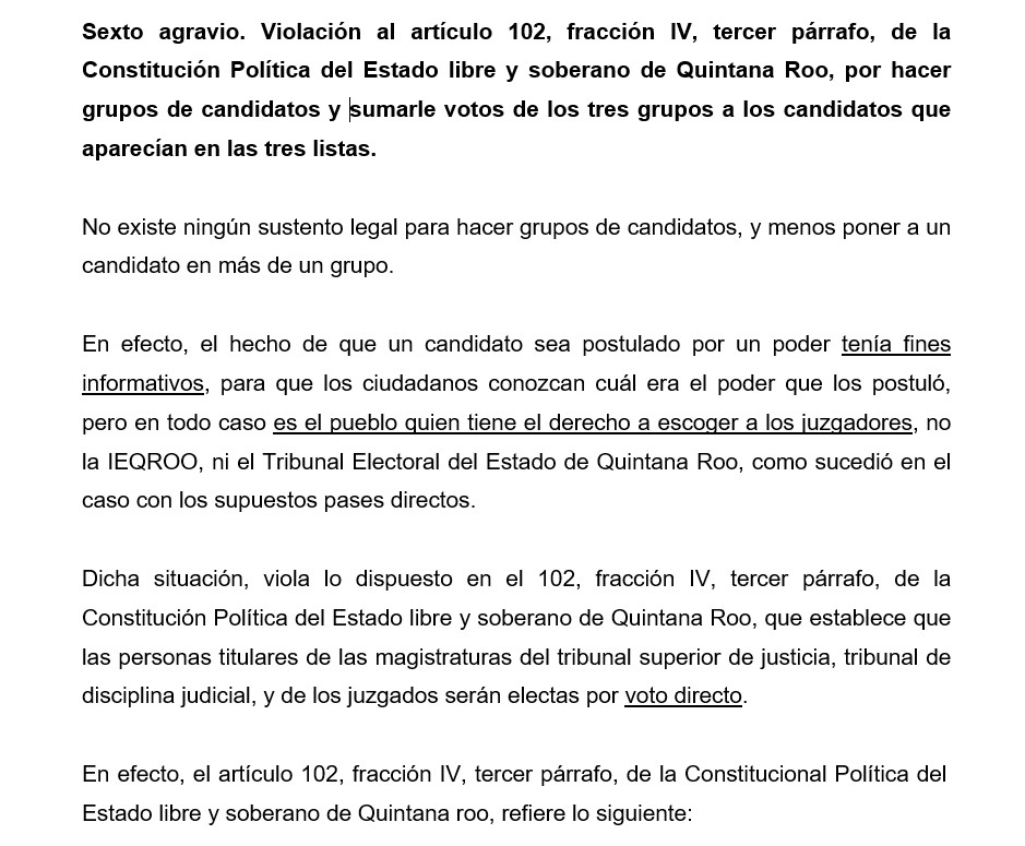 Entre los agravios enumerados están que las boletas sobrantes o sin utilizar no fueron canceladas en las mesas directivas de casilla y no se permitió la presencia de observadores electorales en los cómputos de los votos realizados en los consejos municipales del Ieqroo.