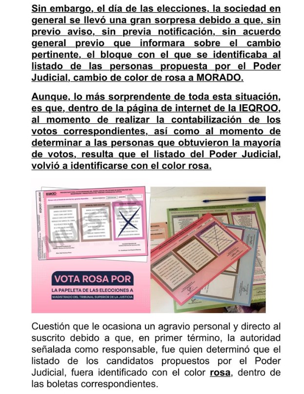 Además, en su demanda señaló que el Ieqroo cambió el color del marco que tocaba para identificar la lista del Poder Judicial, que en el acuerdo era de color rosa, pero en la papeleta impresa salió morada, sin avisar a la ciudadanía.