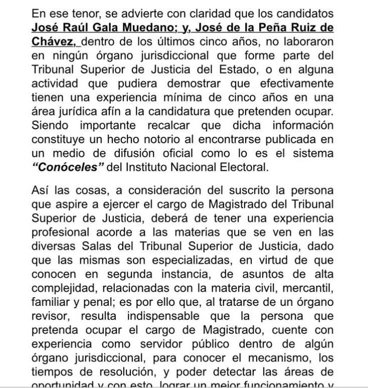 Cabe mencionar que, al respecto, su demanda afirma que a partir del currículum de ambos personajes “se advierte con claridad que los candidatos José Raúl Gala (sic) Muedano y,  José de la Peña Ruiz de Chávez, dentro de los últimos cinco años, no laboraron en ningún órgano jurisdiccional que forme parte del Tribunal Superior de Justicia del Estado, o en alguna actividad que pudiera demostrar que efectivamente tienen una experiencia mínima de cinco años en una área jurídica afín a la candidatura que pretenden ocupar”.