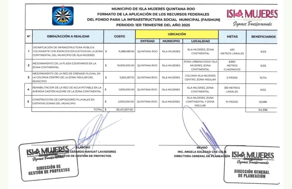 En el primer trimestre del 2025 la alcaldesa morenista Atenea Gómez Ricalde a traves de William Conrado entrego cinco contratos de obras públicas del fondo para la infraestructura social, municipal (FAISMUN) por un monto total de $30 millones 411 mil 557 pesos.