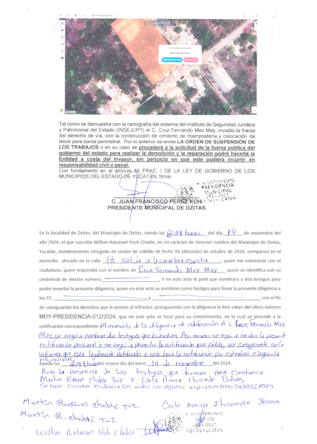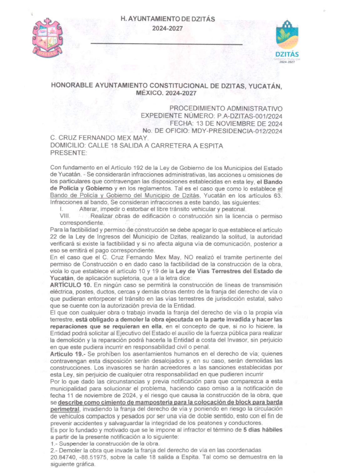 Por su parte, el H. Ayuntamiento emitió un comunicado oficial justificando sus acciones. Según el texto, el propietario de la obra, Cruz Fernando Mex May, habría incumplido con los permisos de construcción necesarios y las normas de vías terrestres del estado, a pesar de múltiples notificaciones y prórrogas para regularizar su situación.
