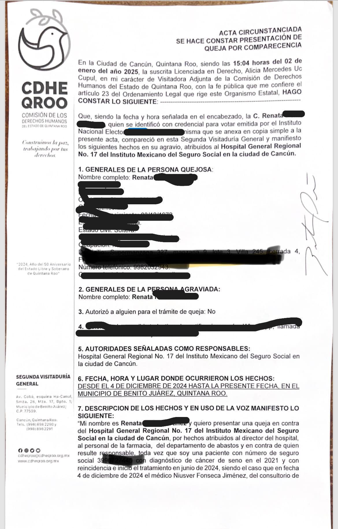 Cansada de la situación, acudió a la Comisión de los Derechos Humanos de Quintana Roo para interponer una queja, esperando que de esta manera la autoridad competente se digne poner atención a algo tan grave como es el desabasto de medicamentos oncológicos y recordó, con preocupación, que el tratamiento no se debe interrumpir para evitar que las células cancerígenas se reproduzcan.
