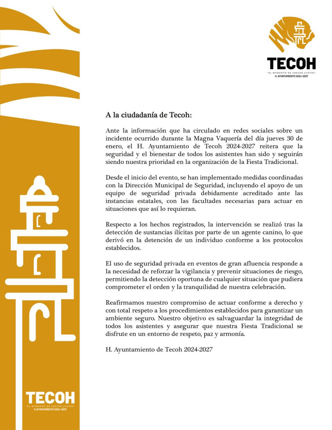 TECOH, YUCATÁN, 3 DE FEBRERO DE 2025.— La seguridad en la feria tradicional de Tecoh se convirtió en un tema de controversia luego de que ciudadanos denunciaron la presunta actuación irregular de un grupo de seguridad privada, que bajo la aprobación del Ayuntamiento y en coordinación con la Policía Municipal, habría incurrido en detenciones arbitrarias y cobros para liberar a los retenidos.