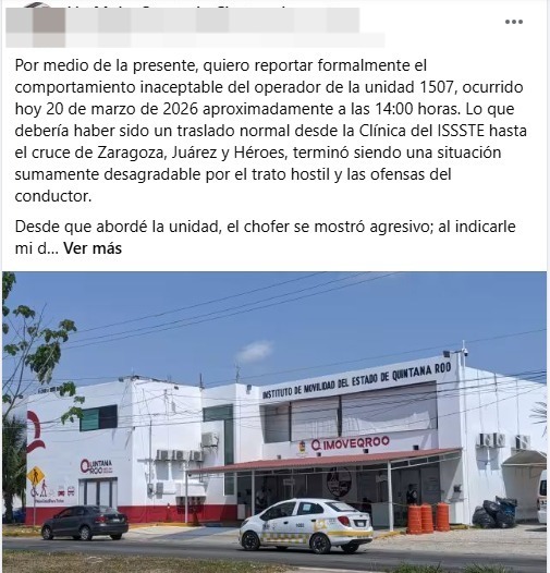 CHETUMAL, 20 de marzo. — Una nueva denuncia por maltrato y falta de profesionalismo en el servicio de transporte público de la capital del estado ha encendido las alarmas en redes sociales. Una usuaria, cuya identidad se reserva por seguridad, denunció formalmente el comportamiento hostil y despectivo del operador de la unidad de taxi número 1507, quien durante la tarde de este viernes protagonizó un episodio de agresividad verbal y acoso hacia su pasajera.