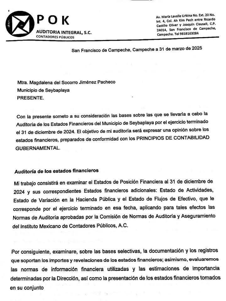 Acusó que Magdalena Jiménez quiere contratar por $150,000 a CQS (Contadores, Asesores y Auditores) para que emita un “Dictamen de Impuesto sobre Nómina del Ejercicio 2024”, y a POK Auditoría Integral, por $130,000, para que realice una “Auditoría de los Estados Financieros del Municipio del 2024”.