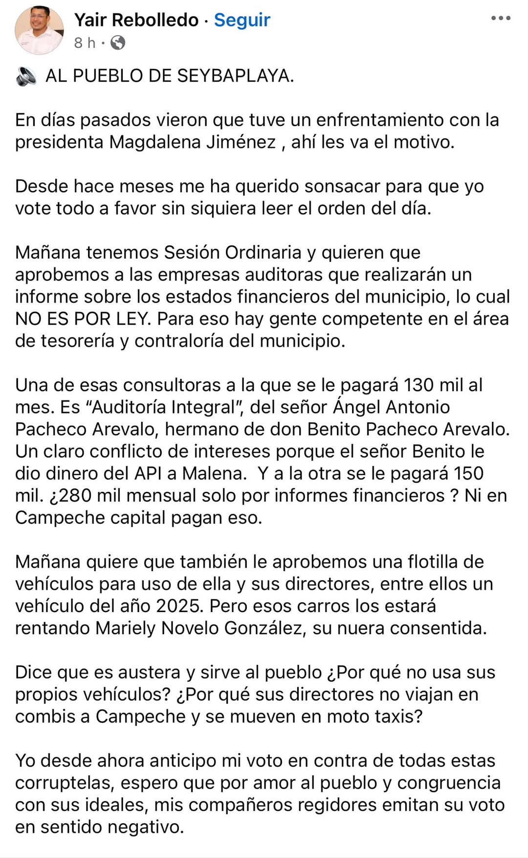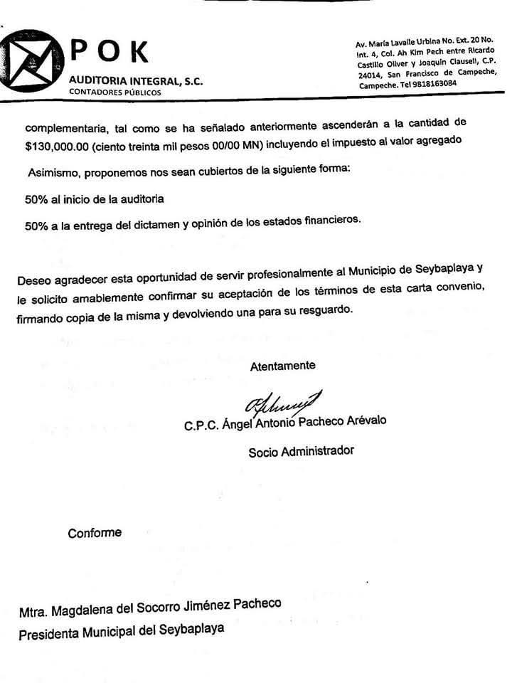 Aún más, señaló que “una de esas consultoras a la que se le pagará 130 mil al mes, es “Auditoría Integral”, del señor Ángel Antonio Pacheco Arevalo, hermano de don Benito Pacheco Arevalo. Un claro conflicto de intereses porque el señor Benito le dio dinero del API a Malena. Y a la otra se le pagará 150 mil. ¿280 mil mensual solo por informes financieros ? Ni en Campeche capital pagan eso”