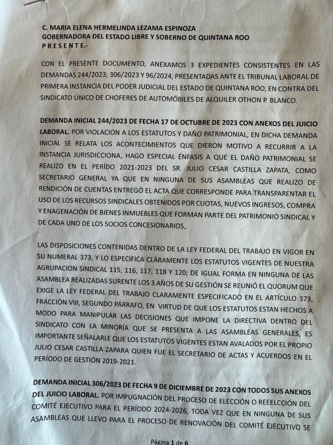 Agregaron que, como consecuencia de las irregularidades cometidas por Castilla Zapata y su directiva en contra del gremio taxista, fueron interpuestas demandas ante los tribunales laborales del estado que pertenecen al Poder Judicial de Quintana Roo.