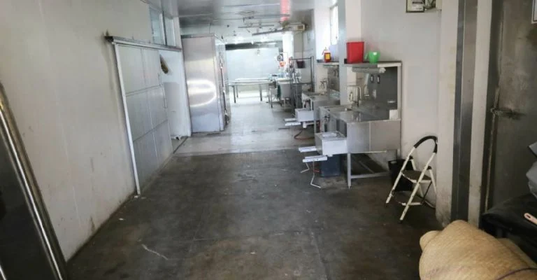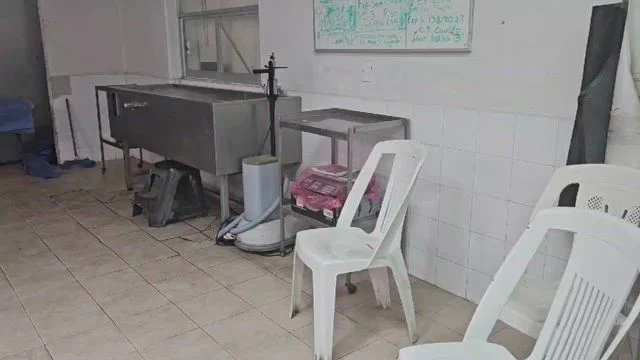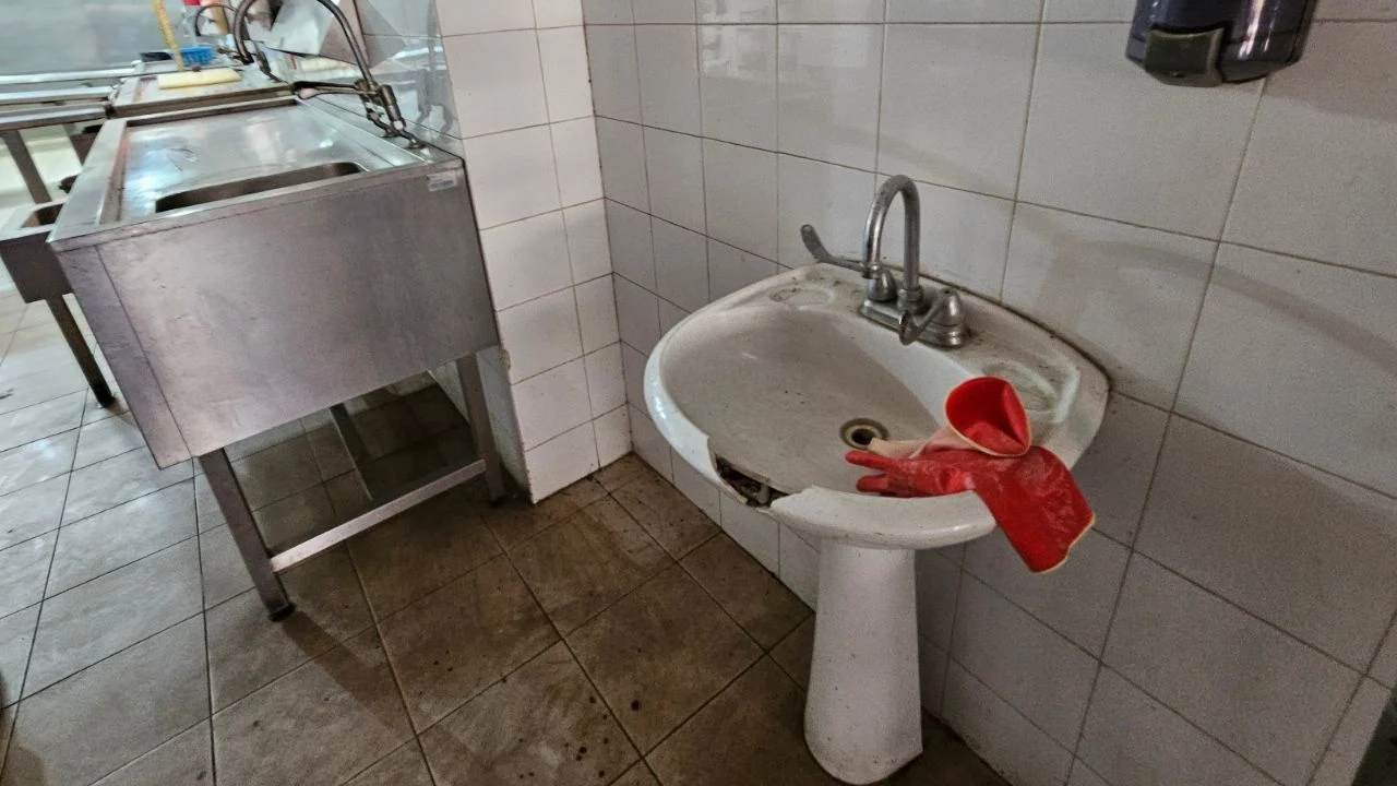 Una vieja mesa de plástico sirve como plancha y el lavabo está roto. El ambiente es pestilente y las moscas abundan.