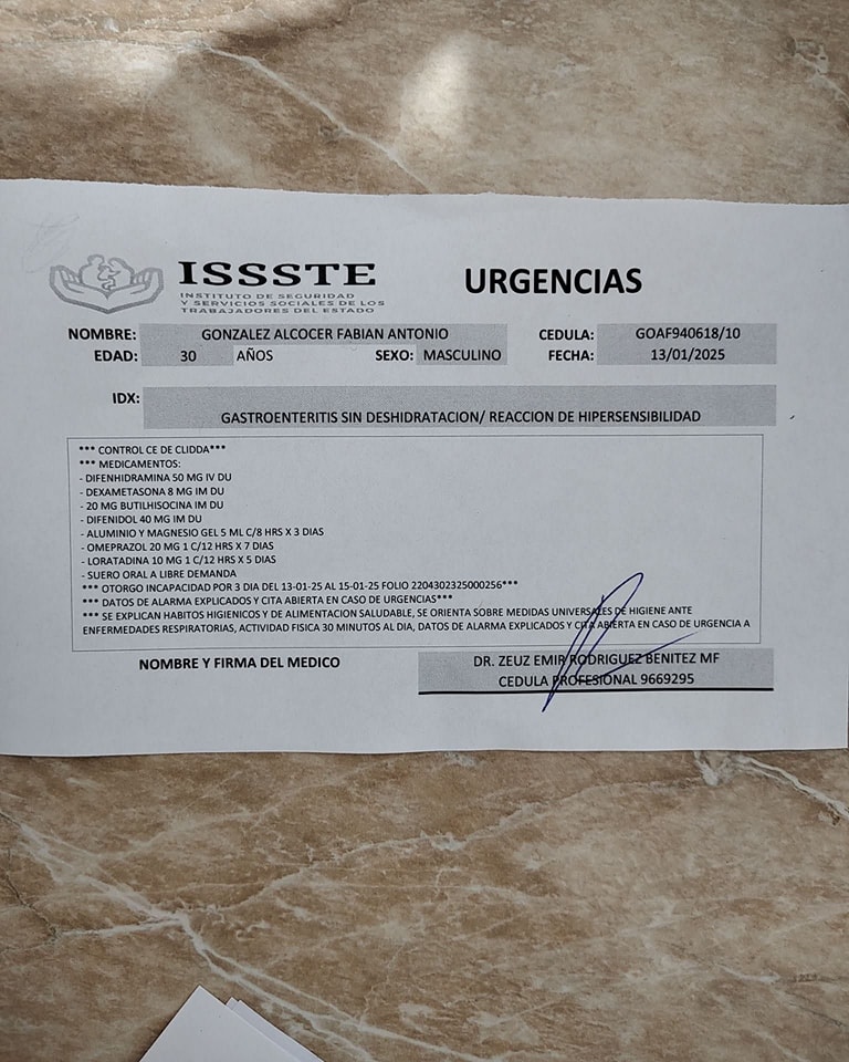 Chetumal, 15 de enero.- Un derechohabiente del ISSSTE en Chetumal denunció públicamente una experiencia desfavorable tras acudir al hospital por una infección estomacal. Según relató, terminó intoxicado luego de que le administraran un medicamento en contra de sus advertencias.