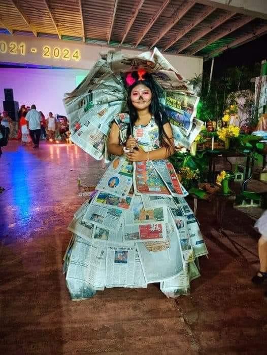 VALLADOLID, YUC. a 4 noviembre 2024.- El ingenio y creatividad se hicieron presentes durante las celebraciones por el Día de Muertos, con la elaboración de un traje de catrina realizado con papel periódico.