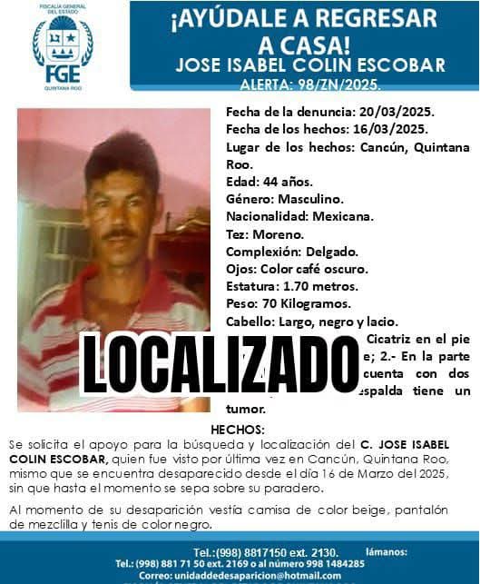 Cancún, 26 de marzo. – La Fiscalía General del Estado (FGE) de Quintana Roo desactivó tres fichas de búsqueda luego de que las personas reportadas como desaparecidas fueran encontradas sin vida, pues las fichas fueron publicadas con la leyenda “localizado” en letras negras.