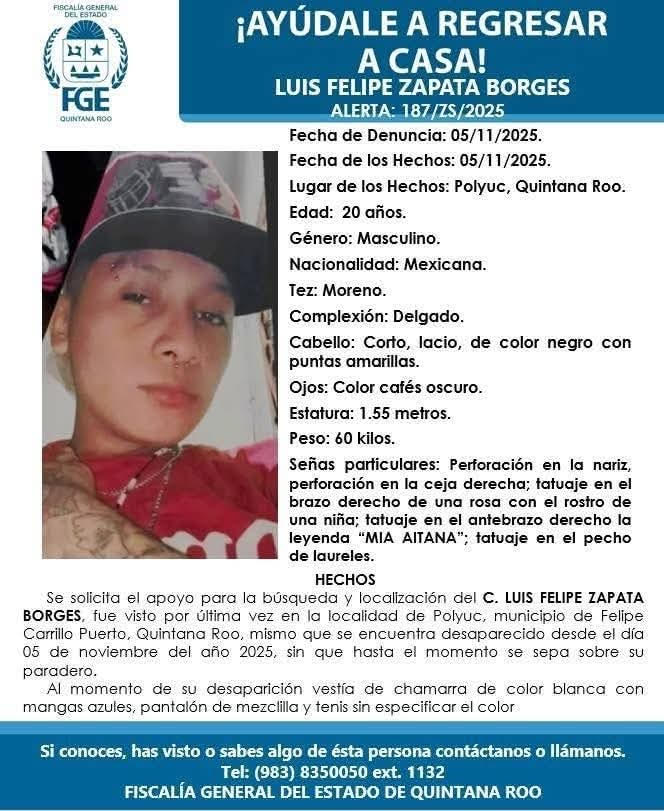 La violencia volvió a irrumpir en Felipe Carrillo Puerto con la desaparición de un joven de 20 años, identificado como Luis Felipe Zapata Borges, quien fue privado de su libertad la tarde del miércoles en el Libramiento de Polyuc, cuando esperaba transporte con destino a Mérida.