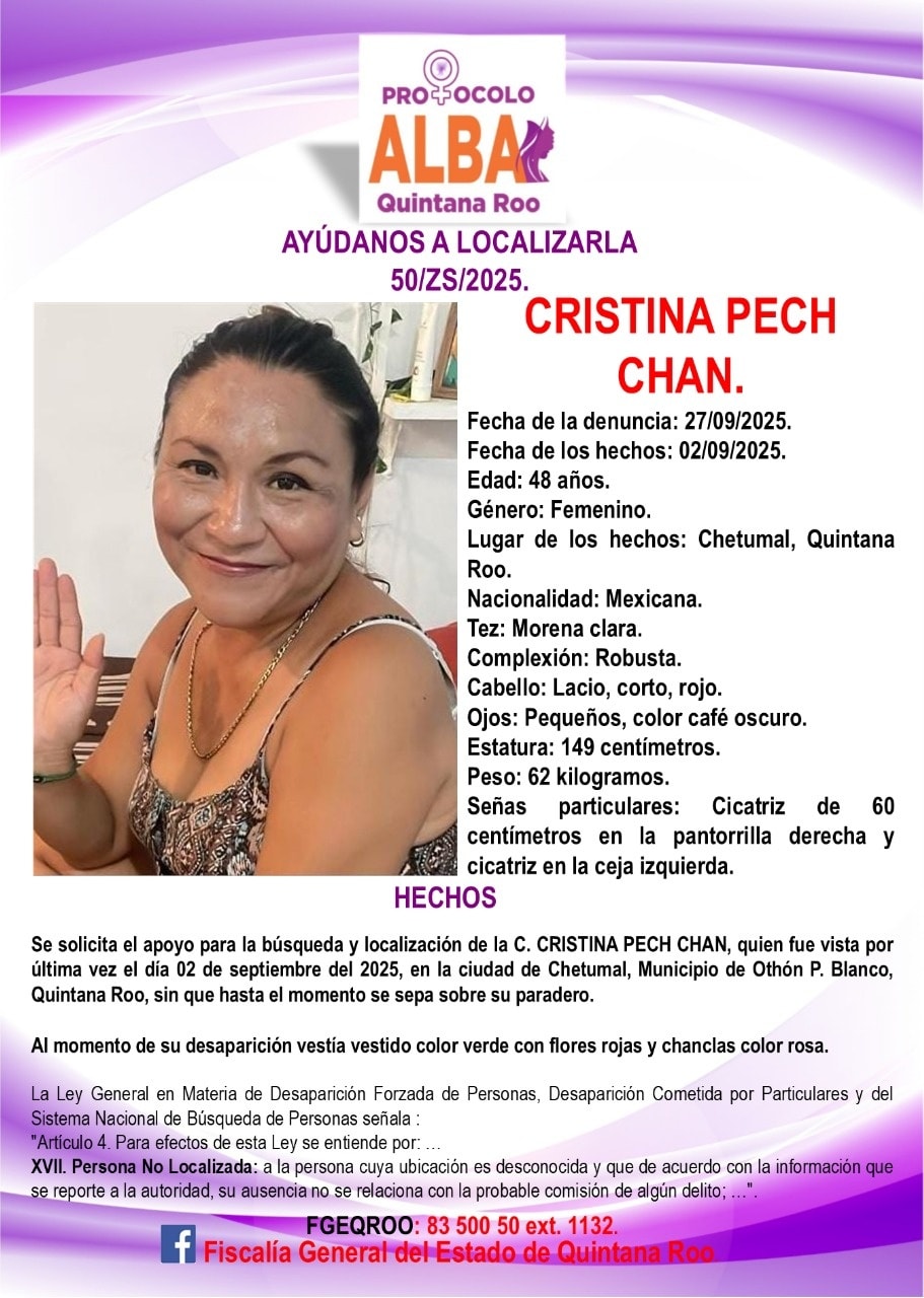 Chetumal, 27 de septiembre.- La Fiscalía General del Estado de Quintana Roo emitió una ficha de búsqueda para localizar a Cristina Pech Chan, mujer de 48 años que desapareció el pasado 2 de septiembre en la ciudad de Chetumal.