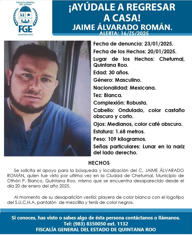 Chetumal, 26 de enero.- La desaparición de Jaime Alvarado Román, un joven taxista de 30 años y miembro del Sindicato Único de Choferes de Automóviles de Alquiler (SUCHAA), ha generado preocupación en la comunidad de Chetumal. El operador fue visto por última vez el lunes 20 de enero de 2025, cuando transportaba a un pasajero hacia la ribera del río Hondo, en el municipio de Othón P. Blanco, sin que desde entonces se conozca su paradero.