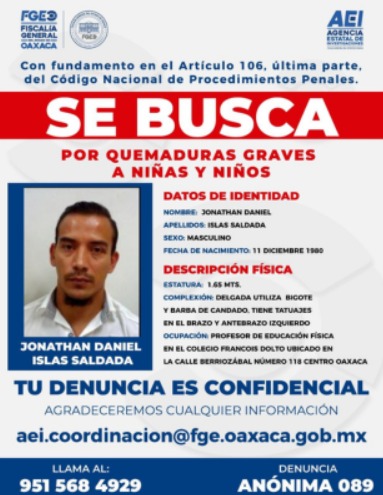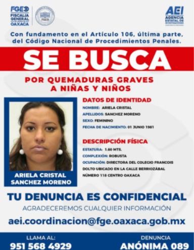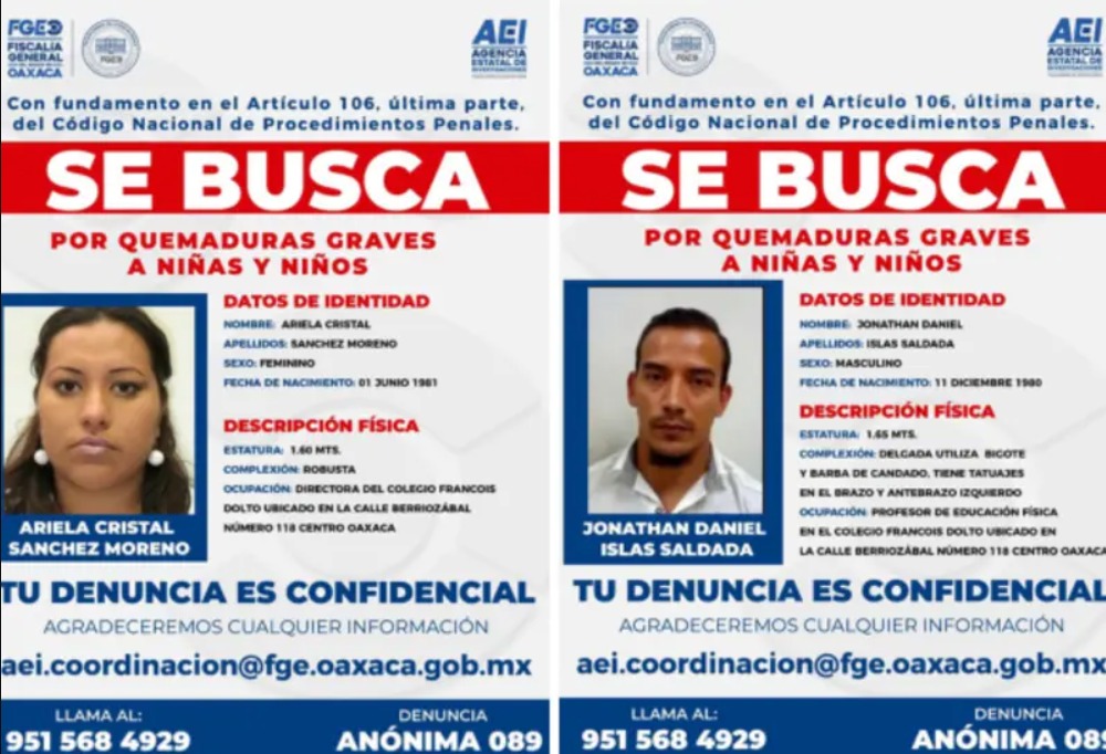 La Fiscalía General del Estado de Oaxaca (FGEO) emitió fichas de búsqueda contra Ariela Cristal Sánchez Moreno y Jonathan Daniel Islas Saldada, directora y profesor del colegio Francois Dolto, respectivamente, por su presunta responsabilidad en un caso de quemaduras graves ocasionadas a niñas y niños. Ambas personas son buscadas por la Agencia Estatal de Investigaciones (AEI), con fundamento en el artículo 106, última parte, del Código Nacional de Procedimientos Penales, relacionado con actos que han causado lesiones severas a menores de edad.