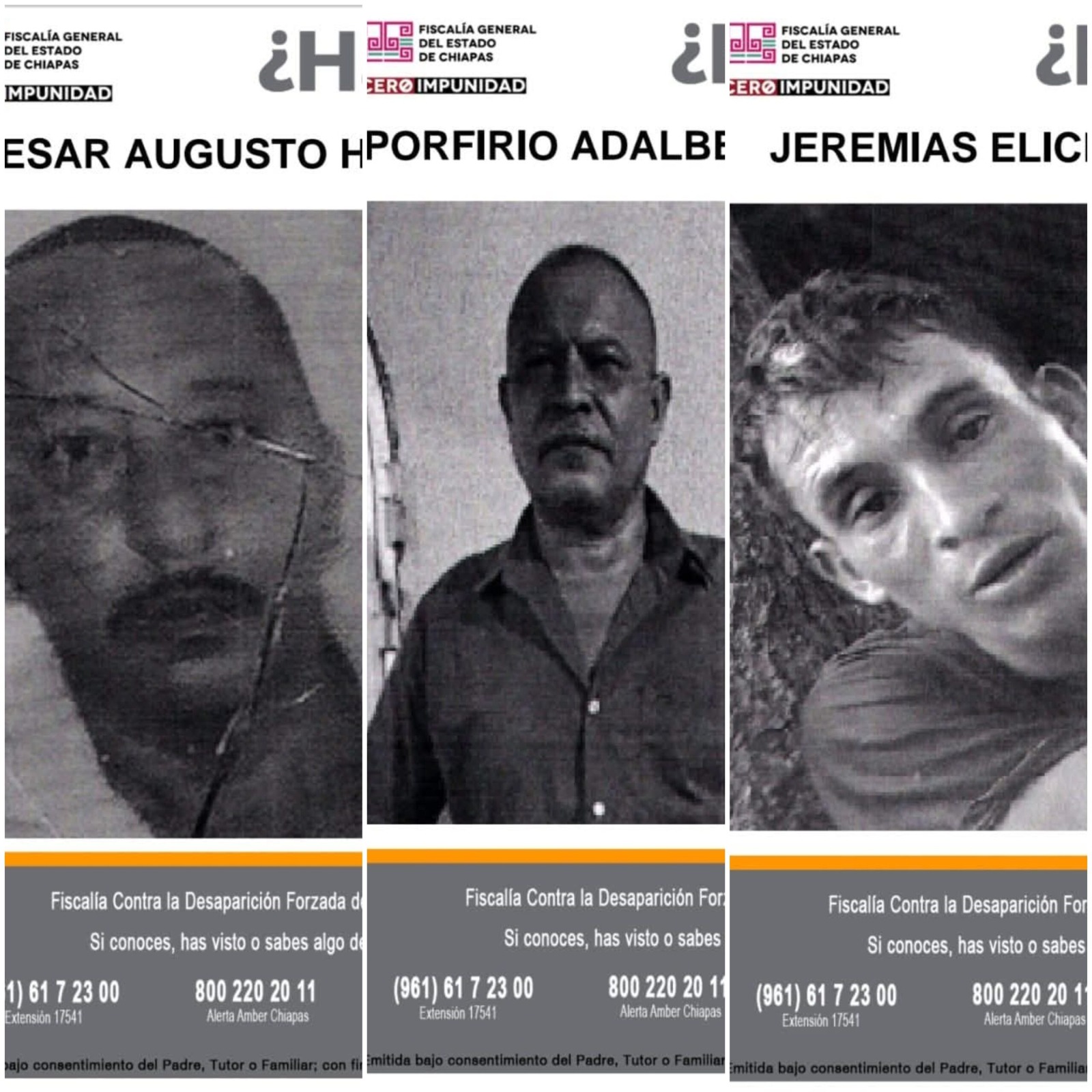 Tapachula, Chis. Autoridades de Chiapas y Guatemala realizan diversas tareas de investigación para localizar a tres guatemaltecos que desaparecieron cuando se dirigían a Tuxtla Gutiérrez, informaron fuentes oficiales. Se trata de Porfirio Adalberto Dávila Romero, César Augusto Hernández Lemus y Jeremías Eliceo Lemus Paredes, quienes viajaron en busca de trabajo y ya no se supo de ellos desde el pasado 31 de marzo.