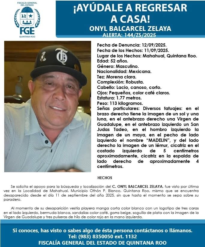 Por último, se reportó la desaparición de Onyl Barcarcel Celaya, de 52 años, con paradero desconocido desde el 11 de septiembre. El hombre es de complexión robusta, cabello corto canoso y ojos café claro. Entre sus tatuajes destacan una Virgen de Guadalupe, San Judas Tadeo y una figura maya. También lleva inscrito el nombre “Madelin” en su piel.