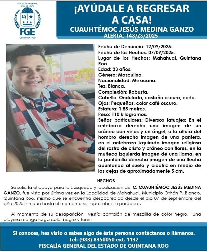 La segunda ficha activada es la de Cuauhtémoc Jesús Medina Ganzo, de 23 años, visto por última vez el 7 de septiembre. Sus señas particulares incluyen tatuajes en brazos y hombros, como un cráneo con velas, un ángel, una pantera y la imagen de Cristo. Al momento de su desaparición vestía pantalón de mezclilla negro, playera de manga larga negra y tenis. Su familia pide apoyo ciudadano para aportar información que facilite las investigaciones.