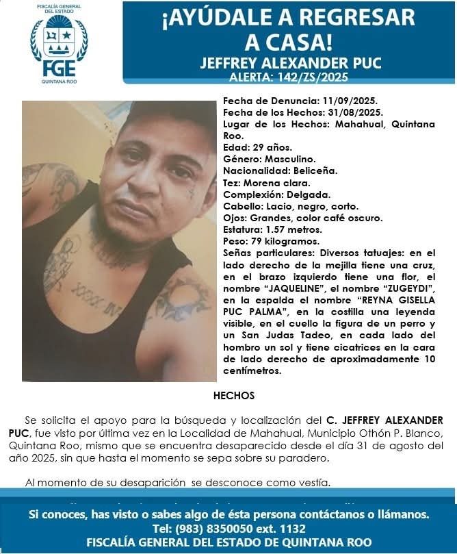 El primero de los casos corresponde a Jeffrey Alexander Puc, de 29 años y originario de Belice, desaparecido desde el pasado 31 de agosto. De complexión delgada, cabello lacio negro y corto, y ojos café oscuro, fue descrito con diversos tatuajes: en la mejilla derecha, en el brazo izquierdo una cruz y una flor, así como los nombres “Jacqueline” y “Zuheydi”. La fiscalía destacó la importancia de cualquier dato que permita ubicarlo.
