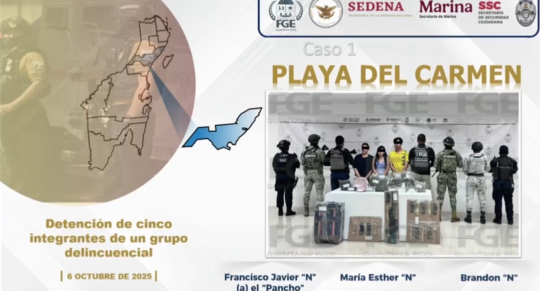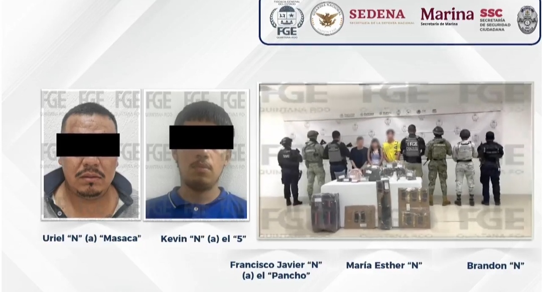 Los detenidos fueron identificados como Francisco Javier ‘El Pancho’, de 35 años, María Esther N y Brandon N, de 23 años, todos originarios de Michoacán. La detención se llevó a cabo en el fraccionamiento Cataluña de Playa del Carmen.