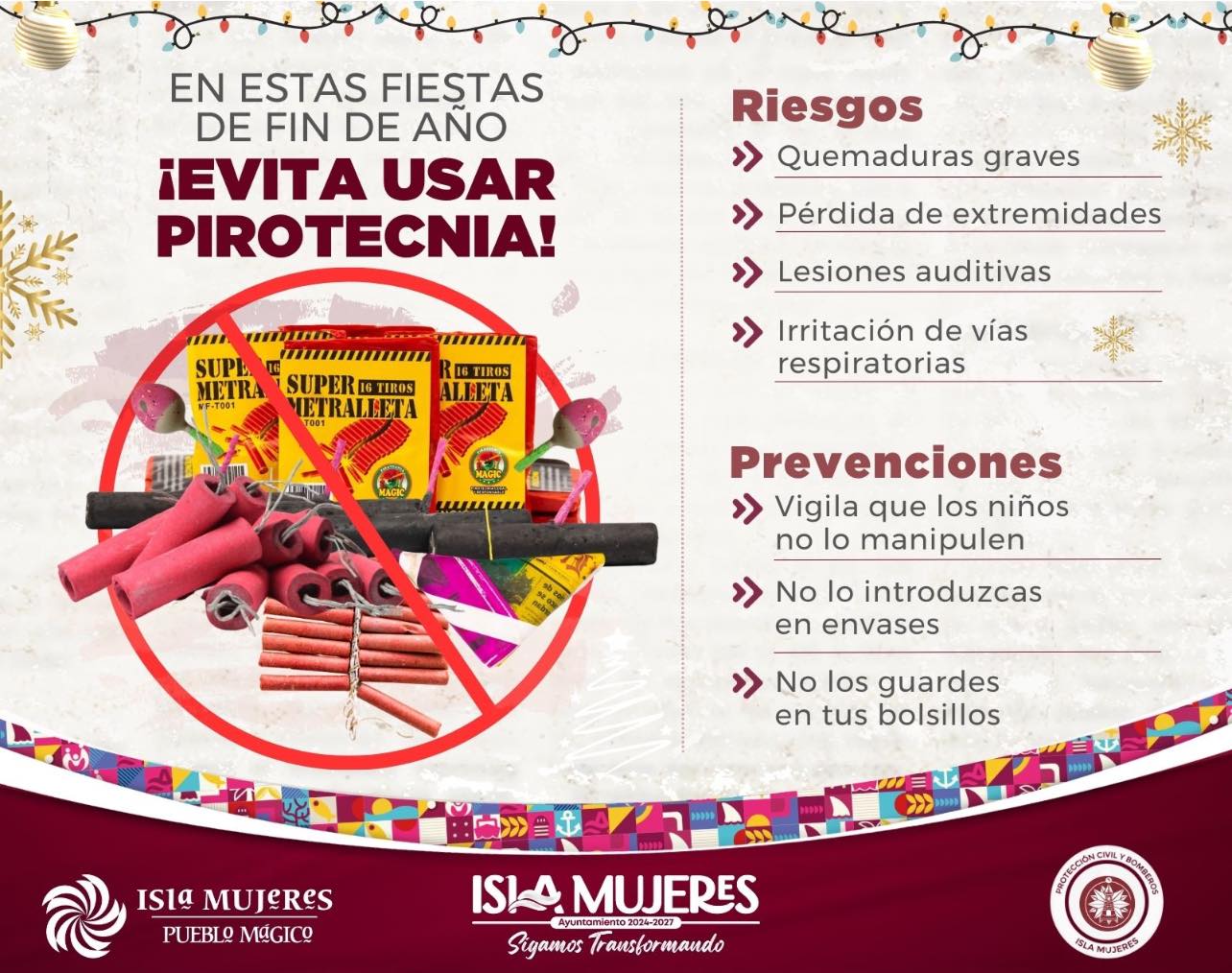 ISLA MUJERES, Q.ROO, 29 de diciembre-. Mientras que el secretario general Hugo Sánchez Montalvo, ha declarado terminantemente prohibida la compra, venta y distribución de pirotecnia en el municipio, una publicación reciente en las redes sociales del mismo Ayuntamiento simplemente aconseja evitar su uso, sin mencionar explícitamente la prohibición.