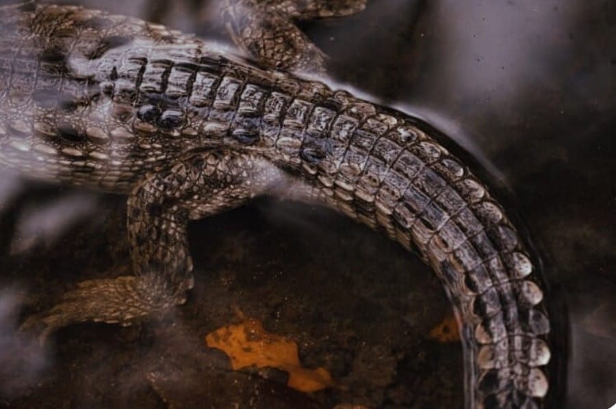 Escamas caudales de una cría de cocodrilo en Banco Chinchorro: a diferencia de Cozumel, aquí la cola muestra un patrón más uniforme, con menos escamas irregulares fuera de las hileras principales. Foto: Miguel Ángel Guillermo Amador