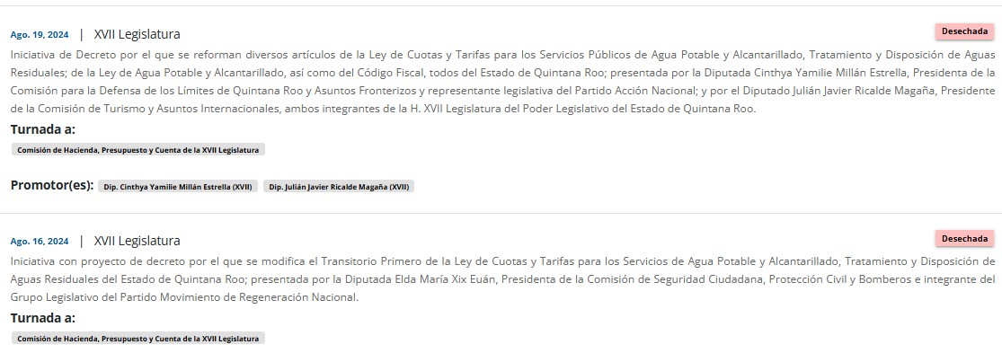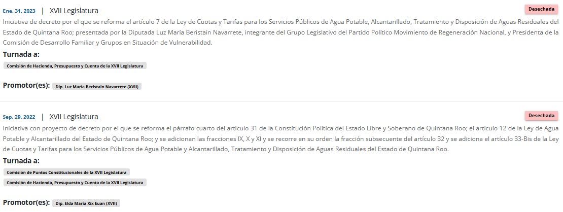 La primera de estas iniciativas desechadas la presentó el 29 de septiembre del 2022 la diputada Elda Xix, prácticamente iniciando la XVII Legislatura, para proponer la reforma del párrafo cuarto del artículo 31 de la Constitución Política del Estado; del artículo 12 de la Ley de Agua Potable y Alcantarillado; y adicionar las fracciones IX, X y XI del artículo 32 y el artículo 33-Bis de la Ley de Cuotas y Tarifas para los Servicios Públicos de Agua Potable y Alcantarillado, Tratamiento y Disposición de Aguas Residuales del Estado de Quintana Roo.