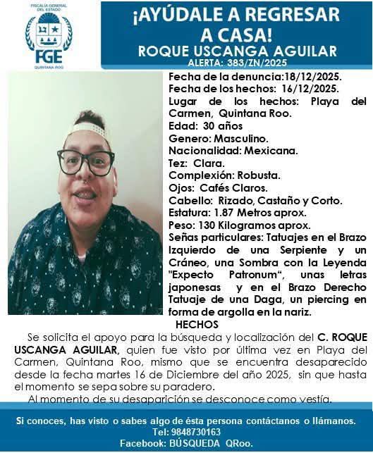 Playa del Carmen, 19 de diciembre.- La comunidad de Playa del Carmen se encuentra en alerta tras la desaparición de Roque Uscanga Aguilar, de 30 años de edad, de quien no se tiene noticia alguna desde el pasado martes 16 de diciembre.