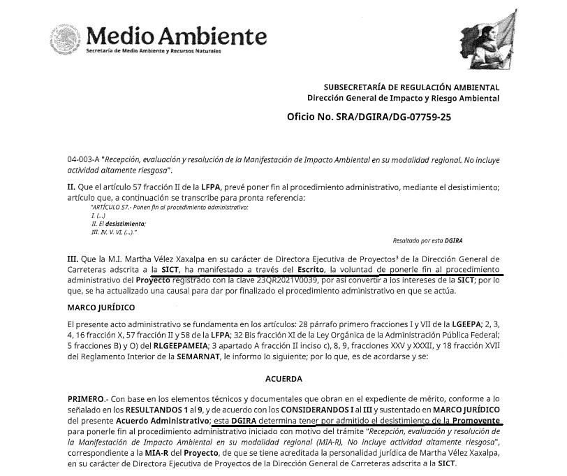 El desistimiento del trámite fue solicitado el 25 de septiembre y la Secretaría de Medio Ambiente y Recursos Naturales (Semarnat) lo aceptó el pasado 2 de octubre.