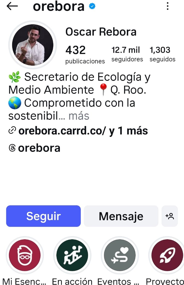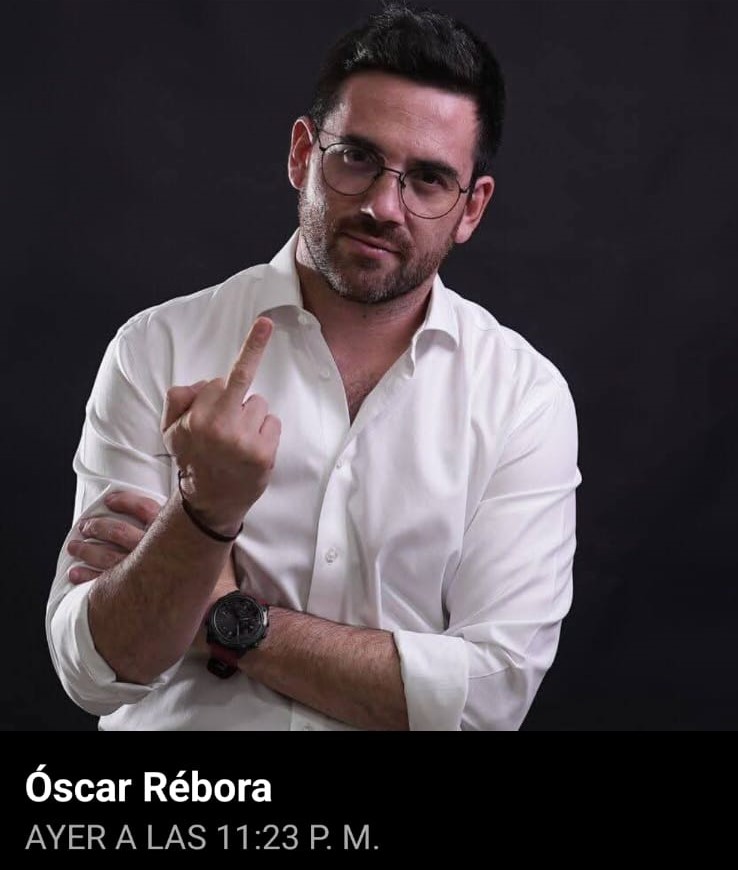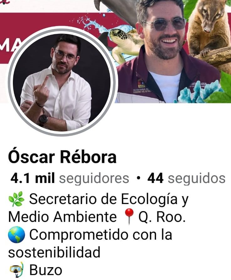 CHETUMAL, 12 de octubre.- El secretario de Ecología y Medio Ambiente de Quintana Roo, Óscar Rébora Aguilera, captó polémicamente la atención de un sector del público quintanarroense por difundir en sus redes sociales una foto de perfil donde dedica corte de manga y dedo medio levantado a quienes la vieran, en medio de la campaña que realiza para promocionar su imagen personal aprovechando el cargo que ostenta.