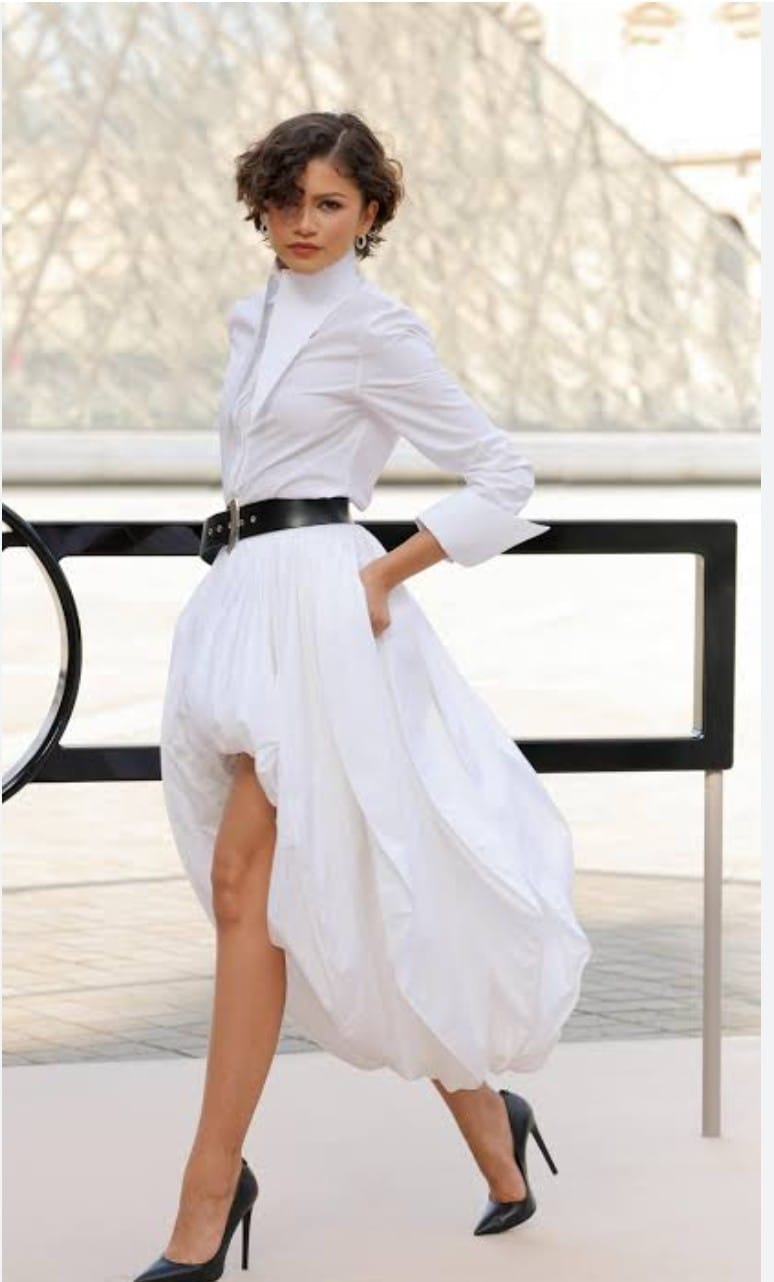 Así que la presencia de Zendaya no podía faltar en el desfile de Louis Vuitton en la Semana de la Moda de París. Su vestido blanco fue el protagonista, gracias a su diseño asimétrico, conocido como mullet, con una falda globo: el frente es corto, mientras que en la parte trasera tiene una caída hasta los tobillos.
