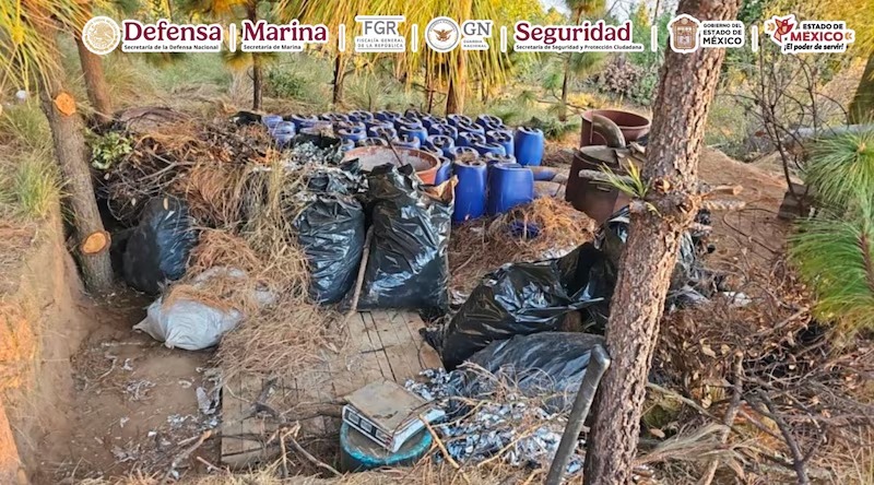 También se aseguraron 105 bidones con químicos de 50 litros aproximadamente, 18 tinas color café, tres mezcladoras, siete ollas de peltre, dos básculas, tres batidoras, una olla para mezclar, 19 costales de peróxido, una caja de precursor con 50 kilos aproximadamente, 10 litros de aceite, una planta de luz, un tinaco cisterna de 10,000 litros, así como 66 tambos de 100 litros con alcohol, tolueno, acetona y cloro, además de diferentes herramientas.