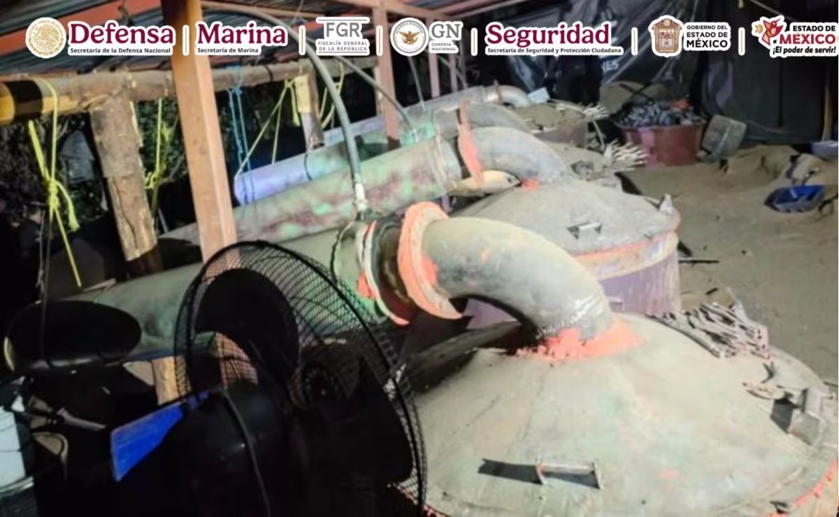 También se aseguraron 105 bidones con químicos de 50 litros aproximadamente, 18 tinas color café, tres mezcladoras, siete ollas de peltre, dos básculas, tres batidoras, una olla para mezclar, 19 costales de peróxido, una caja de precursor con 50 kilos aproximadamente, 10 litros de aceite, una planta de luz, un tinaco cisterna de 10,000 litros, así como 66 tambos de 100 litros con alcohol, tolueno, acetona y cloro, además de diferentes herramientas.