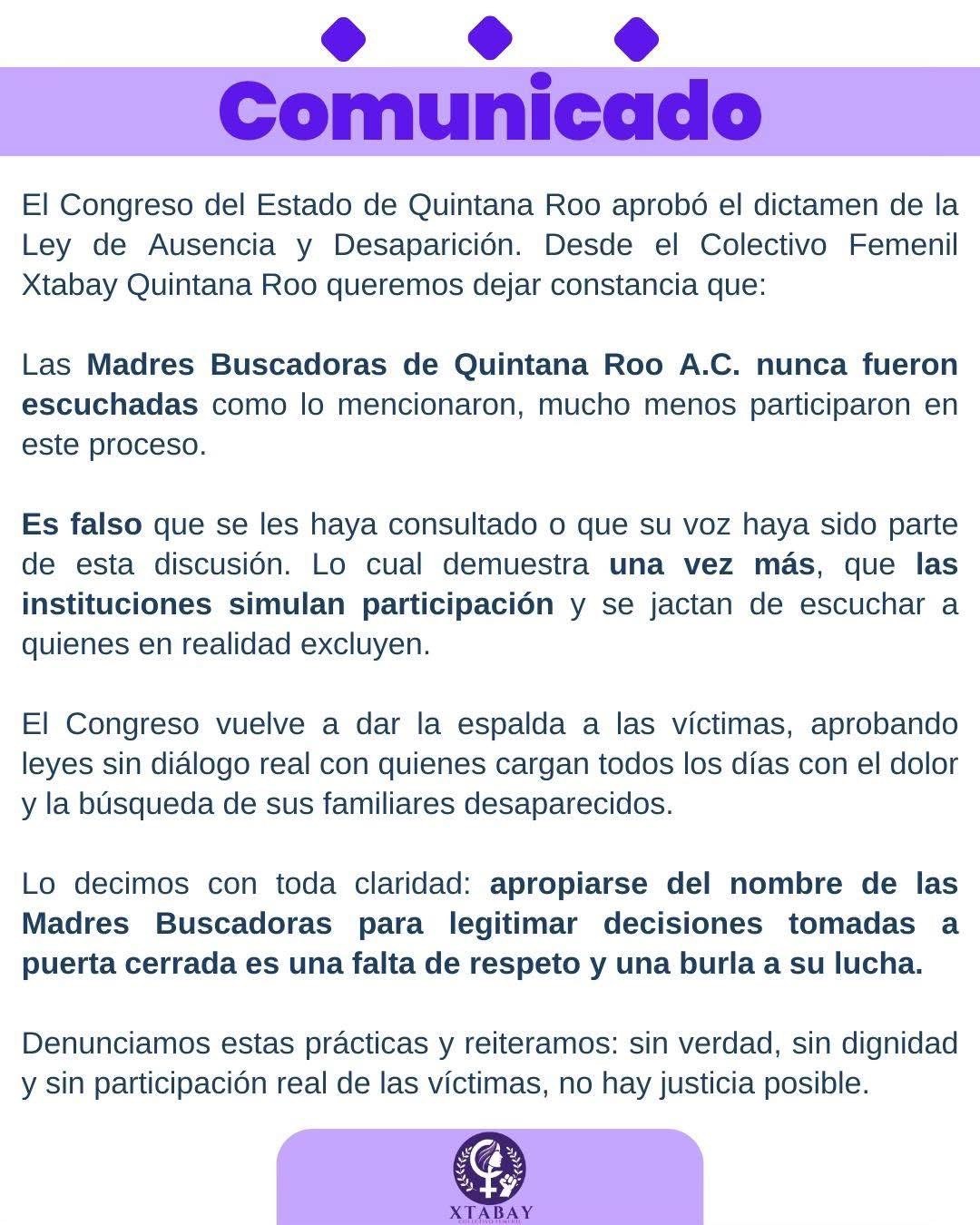El Colectivo Femenil Xtabay  desmintió al congreso de Quintana Roo de no haber escuchado a las madres buscadoras para crear la nueva Ley en Materia de Declaración Especial de Ausencia para Personas Desaparecidas del Estado, dejando en evidencia la prácticas de simulación y falta de diálogo real con las víctimas.