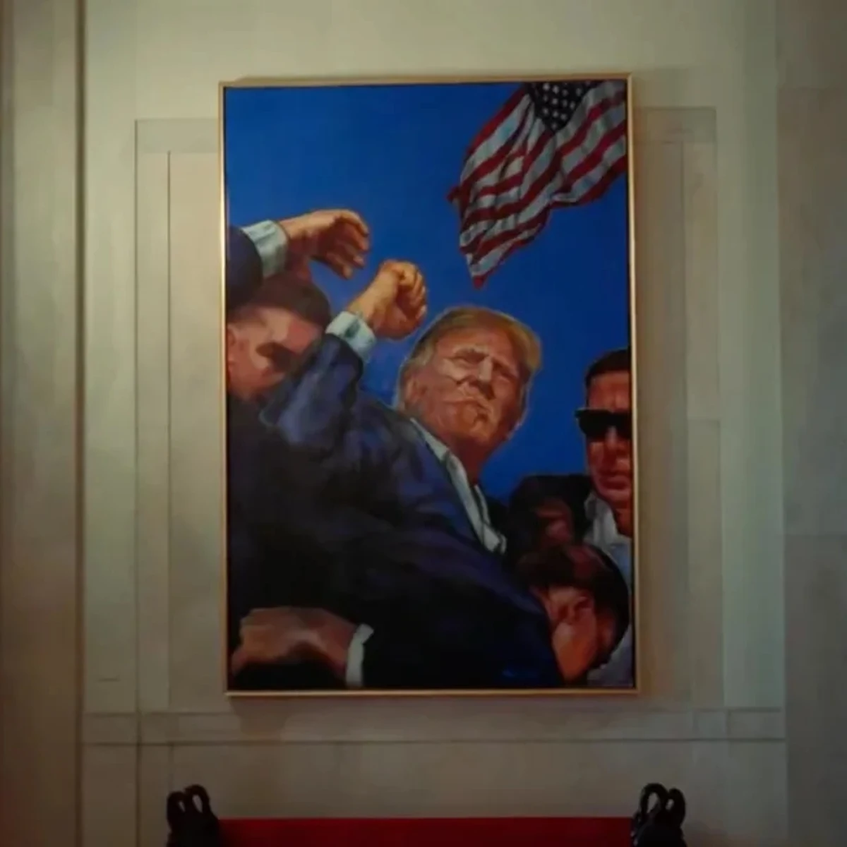 La Casa Blanca anunció el inesperado cambio en una publicación en su cuenta oficial en la red social X con una fotografía de la nueva pintura acompañada por la frase: “Algo de arte nuevo en la Casa Blanca” y un par de emojis de ojos. La pintura captura las secuelas de un intento de asesinato contra Trump durante un mitin en julio del año pasado en Butler, Pensilvania. Trump fue herido en la oreja y levantó su puño hacia el cielo mientras decía: “¡Lucha, lucha, lucha!”.
