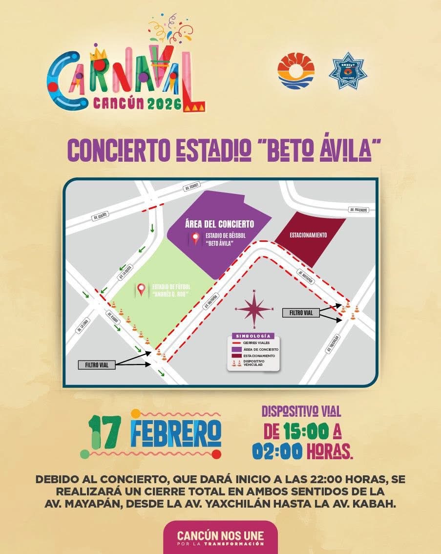 Asimismo, se aplicarán cierres viales desde la madrugada en avenidas cercanas como Mayapán, Kabah y La Luna, los cuales permanecerán vigentes hasta la conclusión del concierto, a fin de facilitar la movilidad peatonal y reducir riesgos ante la concentración masiva de personas.