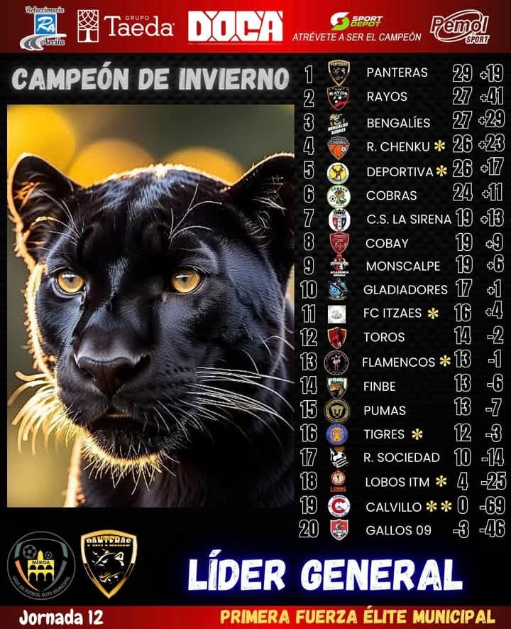 MÉRIDA, YUC. -4 de enero de 2024- Han pasado 12 fechas desde el inicio de la Temporada 2024-2025 de la Primera Fuerza Municipal Elite, circuito que ubica como los lideres a las Panteras, quienes con 29 unidades aventajan a los Rayos MX Pacabtún y los Bengalíes Azores, estos dos con 27 puntos en la segunda y tercera posición de manera respectiva.