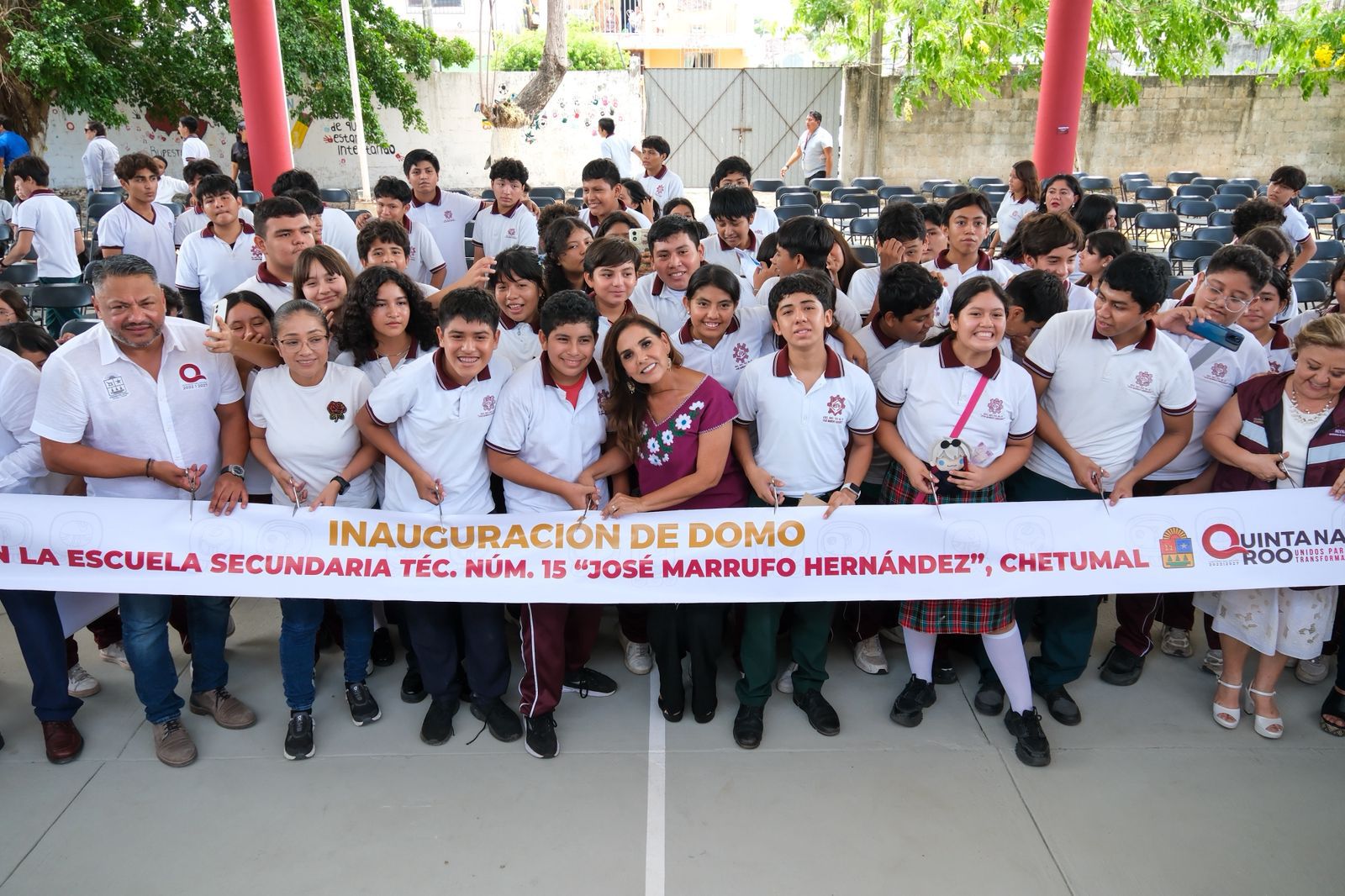 Después de 40 años de espera, la gobernadora Mara Lezama Espinosa inauguró el nuevo domo de la Escuela Secundaria Técnica Núm. 15 “José Marrufo Hernández”, en Chetumal, acompañada de estudiantes, docentes, madres y padres de familia.